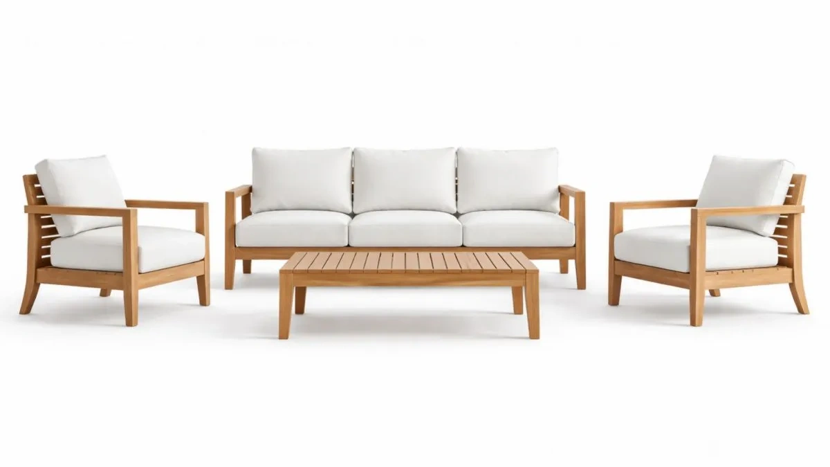 Set salotto in legno teak con cuscini bianchi